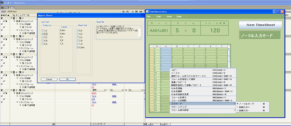 やっとこ公開できる感じになったので、とりあえず現状のVerですがうpします。 スクリプトの記述がしょぼいのはご愛嬌ってことで。 簡単に説明すると、 アニメのタイムシートと同じように数字を入力し、そのデータをAE6.5の複数のレイヤーに キーを打つ為の Javaアプリ&JavaScript です。 ※TimeSheet_beta.exe(app)では、空セルは何も打たない(または、"0"でも可)仕様です。 また、AEのコンポ内のレイヤーのキーを書き出して、Javaアプリで読み込みシートの 修正が出来ます。 シート上でクリップボードへコピーすることで、1つのセルのデータをAEのレイヤーに ペーストすることも可能です。 フォルダ内のファイルは、 ・TimeSheet_beta_v0_4b.exe(app) [ Javaアプリ ] ・_Pref フォルダ [ TimeSheet用環境設定フォルダ ] ・00_TimeSheet_set.ffx [ AE用アニメーションプリセットファイル ] ・ImportSheet_betaB.jsx [ AE用スクリプト ] ・exportSheet_beta.jsx [ AE用スクリプト ] ・各ファイルのReadMe となっています。 ※更新しました (09/03/11) 詳しくはフォルダ内のReadMeを見て下さい。 Java 1.5 必須 (TimeSheet_beta) AfterEffects 6.5 (Script) Windows XP professional SP3 (動作確認済) Mac OS 10.4.11 (動作確認済) Mac OS は10.5の確認が出来ていません。 もし、動作がおかしい場合は残念ですが使用しないでください。 将来的に対応はすると思いますが、その時はAEのverも上がってるかもしれません。 ReadMeの内容がわかりにくいので、もし、わかんねーよ! ヽ(`Д´#)ノ という方はお尋ねください。 動作不良やバグなど、ご指摘もお待ちしております。 投票ボタン付けてみました。
