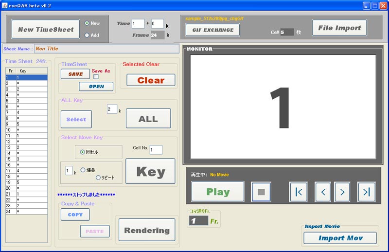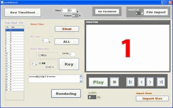 といっても、意味不明な動作不良もあったりしますが サックリ強制終了させてください・・・・ ↓ こんな感じ アプリの概要としましては、アニメーション制作で使われている1秒=24フレームの タイムシート上で指定したタイミングで、GIFアニメを作成、再生します。 QAR(クイックアクションレコーダー)みたいなことをJavaで動かそうというものです。 他にあるアプリケーションで同じようなことは出来ますが、直接24フレームで タイミングが付けられるものはないようなので制作しました。 アニメ屋が直感的に使用できることを目的としていますので、24フレームになじみの 無い方にはどうでもいいアプリかもしれませんw もし「ちょっといじってみても、ええよ?」って奇特な方がいるならば、 暇つぶしに使ってみてください。 一応、ReadMeなるもので解説はしていますが、理解できなかったらゴメンナサイ。 アプリよりもファイルサイズがでかいですがw 何かありましたら、ご報告ください。 あまり大っぴらに配布するつもりはハズカシイから現時点ではありませんので 急にリンクが切れていた場合、そのままにしている場合があります。 尚、今回の制作に関してはさまざまなサイト様から参考にさせていただきました。 特に、MOYO Laboratory様の「GIF 画像出力」のページには大変お世話になりましたので 感謝致したいと思います。 MOYO Laboratory様サイト 注意!! 他のアプリケーションが立ち上がっていると、メモリの関係上 動作不良を起こす可能性があります。 他のアプリでの作業中に実行しないことを強くお勧めします。 投票ボタン付けてみました。 続きます --------------------------------------------------------------------------------