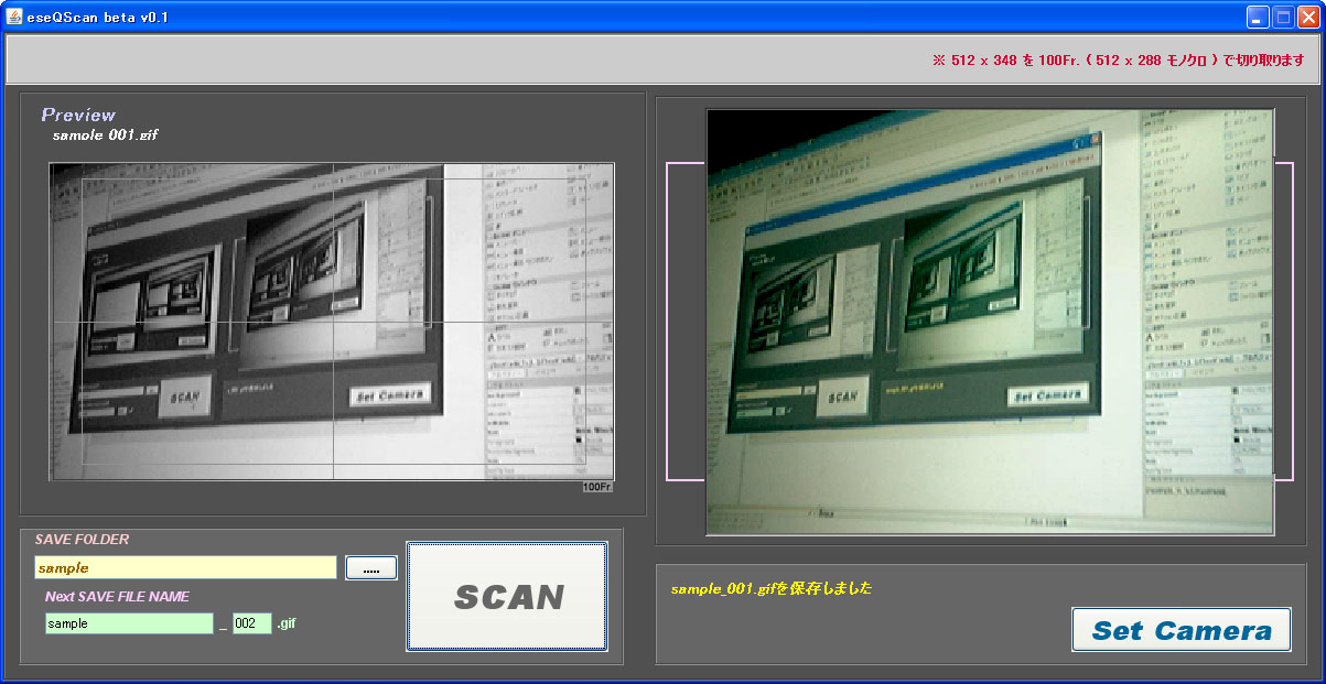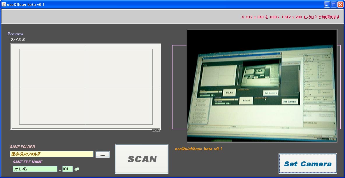 更新内容は、eseQARと同じくダイアログの高速化と、カラーに対応しました。 前のバージョンでは、保存先のフォルダを選択する形になってましたが、 今回からは保存先のフォルダ内にファイルを保存する形になります。 ファイル名はダイアログで指定するのではなく、ダイアログを開く前に [ Next SAVE FILE NAME ] に記入した名前をそのまま使用するようにしました。 ダイアログで名前を変更すると ” 変更するなっ ヽ(`Д´#)ノ ” と言われますので ご注意を。 もう1つは、これまではモノクロのみだったのを、カラーでもスキャン出来るようにしました。 これは、eseScanで書き出したカラーの連番を eseQAR に読み込んでも、さほど重くは ならなかったので追加しました。 ↓ 最新版はこちら 右クリックで保存 eseQScan beta v0.6(zip) 過去の記事のものも最新版に入れ替えてありますが、ReadMe は更新していませんので あしからず。 ( "・ω・゛) コピペ 投票ボタン付けてみました。