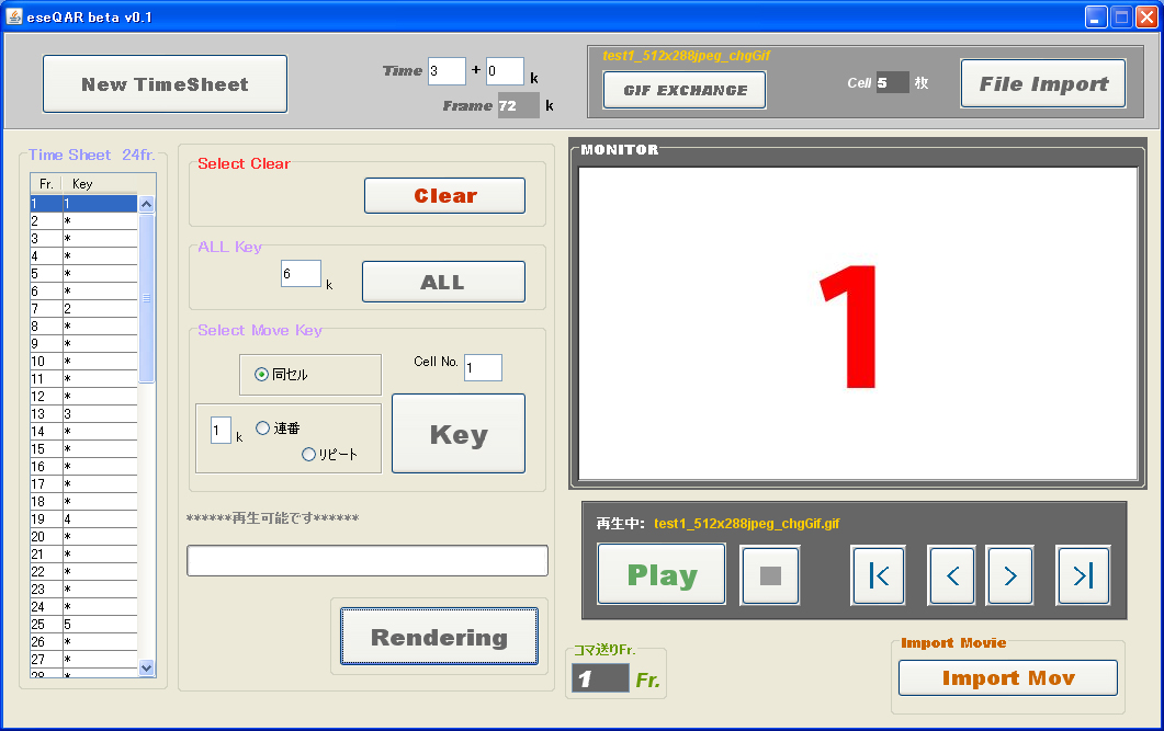 ↓こんな感じ 結局、一度シートのタイミングでアニメーションGIFにした上でそれをウインドウに 再生する形になりました。 ミソは24Fr.のシートで作れるというところですね。 秒への変換は、6Frごとに 1/100 秒足して帳尻を合わせているだけなので あくまで”簡易”なものとしての使用を考えています。 まだまだエラーの回避など、書かないといけないものが多いのですが、 一番ネックになりそうな部分が出来たので、うれしくて上げちゃいましたw 一応スペックとしては、 Java SE 6 必須(Mac OSだと64bit 版のみ対応みたいです・・・) 画像サイズ・・・・・512x288 (16:9) モノクロ推奨(カラーでも一応OK) 読み込み・・・・gif (推奨)、jpeg ( gif に変換するコード有) 再生・・・・・・・・アニメーションGif コマ送り・・・・・gif (推奨)、jpeg (ものすごく遅いので gif に変換推奨) フリーの変換ソフトで jpeg → gif にすると、再生の表示がおかしくなるので アプリに変換コードを入れました。(なぜだかこれで変換するとおかしくならない) 尺が長いとアニメーションGif へのレンダリングに時間がかかってしまうので、 何とかしたいけど・・・・・・う~ん。 状況が進み次第、また書き込みしたいと思います。 投票ボタン付けてみました。 追記しました -------------------------------------------------------------------------------- ちょこちょこ修正しているのですが、うまくいかない・・・・・・ ↓ レイアウトをちょびっと修正 =今ある問題= ・レンダリング中のプログレスバーがうまく作動しない。(もうワケワカンナイ・・・煙出そう) ・5秒12kぐらいまでしかレンダリングしない。(これは何となく予測してたケド) ・リサイズ処理を追加する。 レンダリングに3秒尺だと約16秒、5秒尺だと約30秒ぐらい時間がかかってる。 扱ってる画像が大きいってのもあるけど、CPUに依存なのであまり芳しくないかも。(このPC結構いいやつなので) こういうもの作ると改めて市販のソフトってすごいと思ってしまいました。 ホント、頭使うよね。今まで単純にレンダリングおせーw とか言ってゴメンナサイ。 スクリプトもやりたいんだけど、こっちが気になって手をつけられません。 あともうちょっとだと思うんですけどね・・・・・だと信じたい。 早くこのモヤモヤから開放されてぇ~ PR